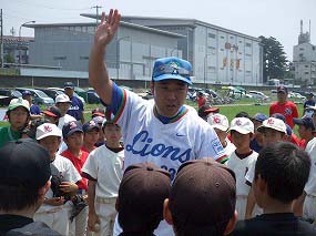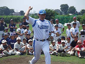 MY PAGE7月13日(日)に東京都調布市・多摩川河川敷グラウンドにおいて「ライオンズOB野球教室」が開催されました。肌に突く太陽の下、元気な狛江・調布市少年野球の小学生約160名が集まり、ライオンズOBの直接指導を受けました。