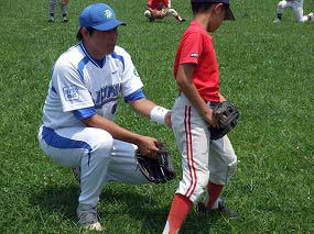 内野守備編では高木大成が自ら捕球姿勢をとって示し、子供たちも初めて試みる低い姿勢での捕球練習に根をあげずに最後までしっかりと教えていただいたことを守っていました。