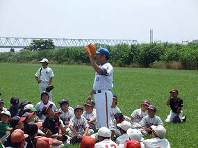 ポジション別の指導では投手編を担当しました小野さんがピッチング実技指導の前に、しっかりとした体をつくるためにも「食事はしっかりと取りましょう。コンビニのお菓子やジュースは、食事前にはできるだけ控えましょう。」と子供たちに食事の大切さを指導していました。実技指導では一人ずつピッチングホームをチェックしてまわり、子供たちも真剣に耳を傾けていました。