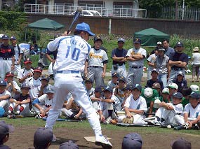 バッティング指導ではロングティーを一人ずつ打ってもらいながら大塚・高木大成による実技指導が行なわれました。大塚さんからは、バッティングをする前に「ボールを良く見て打ちましょう。」・「失敗を恐れずにやりましょう。」と子供たちに説明していました。高木大成からは、構えから体重移動の仕方やボールに対してのバットの振り出し方を実際スイングしながら指導していました。