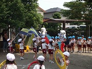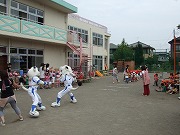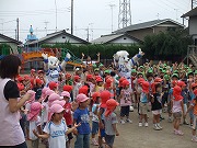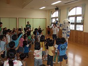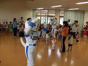 藤沢保育園では“レオくん、ライナちゃん”と園児たちの元気な掛け声で登場し、「まんまる音頭」・「夏祭り」をみんなで輪になって踊り、振りを合わせてたいへん上手に踊っていました。レオくん、ライナちゃんも楽しそうでした。