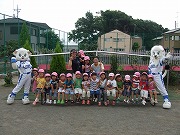 続いて園児チーム対レオ・ライナ・先生チームで綱引きを行い、みんな必死に綱を引き園児たちの強さにびっくりしていました。最後にクラスごとに記念写真を撮り、記念にレオ・ライナのカードが園児に配布されました。