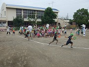 第2なでしこ保育園では、年長児のみんなといっしょに「手のひらを太陽に」を踊りました。レオ・ライナも参加してのクラス対抗リレーでは、緊張している園児もいましたがみんな一生懸命に最後まで完走していました。