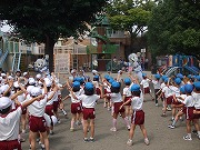 第1なでしこ保育園では、年少児と年中児のみんなといっしょに「手のひらを太陽に」「スイカ大好き」ダンスを踊りました。