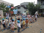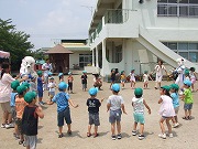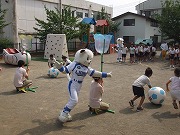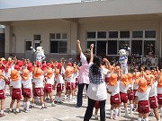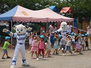 クラス対抗で玉入れと大玉転がしを行い、暑さに負けずにみんなが楽しく参加して、とても楽しい時間を過ごしました。帰り間際には、あちらこちらで「レオくん、ライナちゃん」と呼ばれ大人気者になっていました。