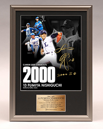 この商品は、記録達成試合の西口投手の勇姿を収めたフォトと、1995年8月16日の記念すべきプロ初奪三振(対 秋山幸二選手)をはじめ、1000奪三振、1500奪三振を達成した試合の写真、さらにサインをコラージュデザインし、アルミ製写真額に収めた記念商品です。