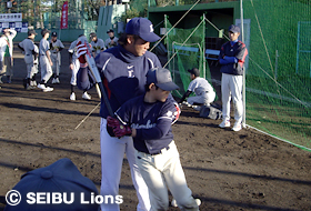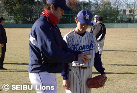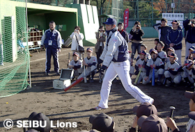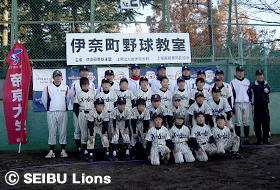 MY PAGE12月4日(日)、伊奈町記念公園において町内の児童生徒120名を対象に、「埼玉西武ライオンズ野球教室」が開催され、坂元弥太郎投手、大島裕行選手、鬼崎裕司選手が講師を務めました。