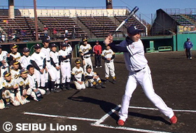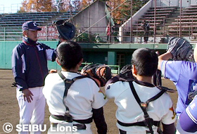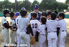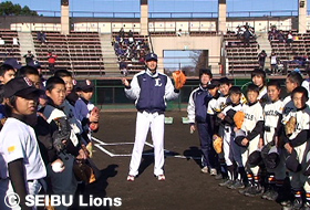 MY PAGE12月11日(日)、本庄市民球場において市内少年野球チームに所属する6チーム小学5・6年生100名の児童を対象に、「埼玉西武ライオンズ野球教室」が開催され、牧田和久投手、岳野竜也選手、熊代聖人選手、梅田尚通選手が講師を務めました。