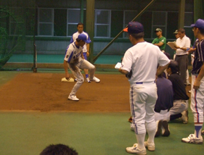 続いて走塁部門での講習を行い、河田コーチが模範プレーを示しながら説明し、皆さまも真剣に聞き入っておりました。