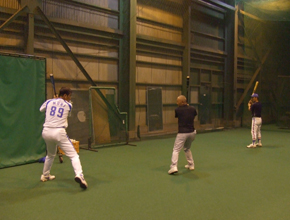 21日(祝)は講習に先立ちプロのキャッチャーフライを体験していただこうと田辺・河田両コーチによるノックがありました。