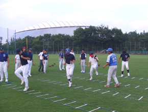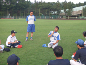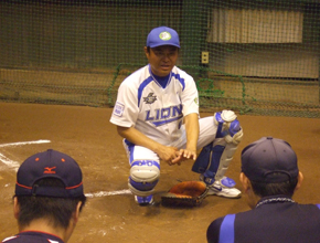 暑さが厳しいにも関わらず、普段後進の指導にあたっておられます対象者24名が参加され福島孝二校長をはじめとするライオンズ現役2軍スタッフによるコーチング指導を受けました。