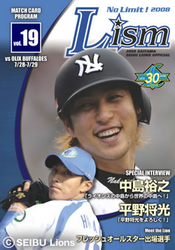 今回の表紙を飾るのは、北京オリンピック代表に選出された中島裕之選手と7月23日のイーグルス戦でプロ入り初勝利をあげた平野将光投手です。