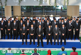 宮崎空港で行われた歓迎セレモニーでは、地元の皆さまやファンの方々に大歓声で迎えていただき、セレモニーで渡辺監督は「優勝するために、宮崎の地から2012年をスタートします。スローガンである“出しきれ”、汗を出し、元気を出し、ファンと共に全力を出しきり、何より結果を出しきりたいと思います。」と、力強く語りました。