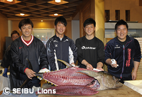 また恒例の夕食時のキハダマグロ解体ショーには、栗山選手、中村選手、そしてルーキーの十亀投手、小石投手が参加。先輩が後輩の口へ、愛情(ワサビ)!? たっぷりのお刺身を…。後輩の絶叫が食事会場に響き、キャンプ前日のひと時を和ませていました。