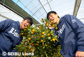 次は、宮崎県が全国一の生産量を誇る金柑の収穫体験に向かいました。熟して甘い金柑を両投手とも気に入った様子で、夢中で摘んでは口に頬張っていました。