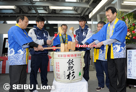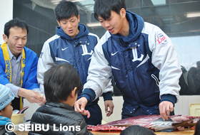 十亀、小石両投手が最初に到着したのは「港の駅めいつ」。同駅の7周年を記念してタビえび入りの大漁汁が振る舞われ、両投手もお手伝い。一人ひとり丁寧に手渡していました。