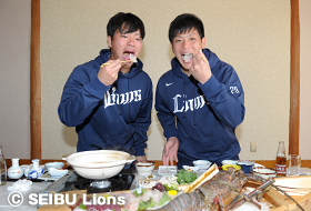 お昼には、当日朝に水揚げされたばかりの伊勢えび、ぶり、そして宮崎牛などを堪能。ぶりが大好物の十亀投手は「食感が違う!」と大満足。