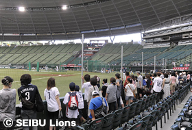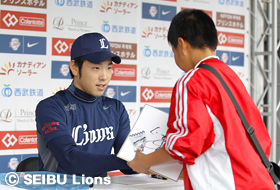 「選手サイン会」では、試合前の練習を終えたライオンズの選手が、あなたの目の前でサインを書いてプレゼント!