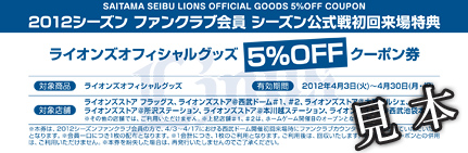 シーズン開幕を祝して、2012年ファンクラブ会員さま限定で、ファンクラブカウンター、ポイントアップブースにて期間中初回来場ポイントアップ時に、ライオンズストアで使用できるクーポン券をプレゼントします!