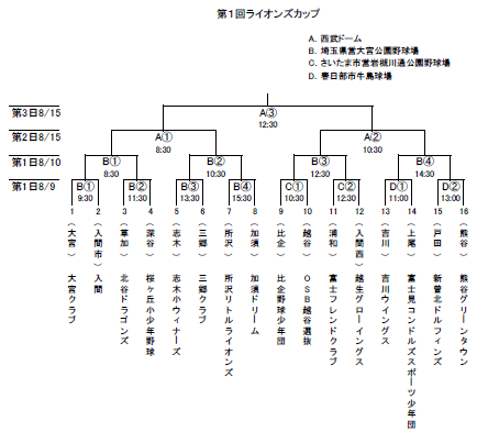 MY PAGE埼玉西武ライオンズでは、地域社会に貢献できる活動・地域に根ざした球団を目指す一環として、埼玉県野球連盟に所属する小学生にて編成されたクラブチームを対象に「ライオンズカップ」を開催しております。各地区の予選を勝ち抜いた16チームにより、下記の日程で決勝トーナメントを行い、準決勝・決勝は、あこがれの西武ドームで行います!