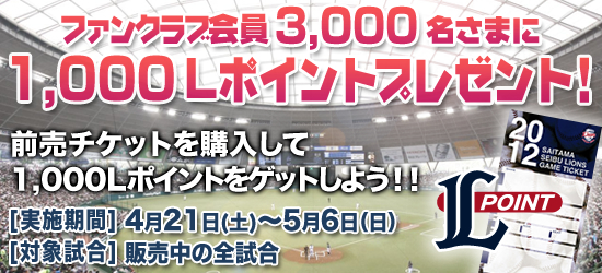 4月21日(土)~5月6日(日)に、ライオンズ主催試合の観戦チケットを前売で購入された会員さまの中から、抽選で3,000名さまに、なんと“1,000Lポイント”をプレゼント!