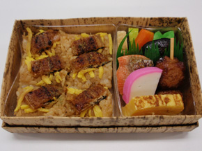 | 内容 | うなぎの俵飯・厚焼玉子・塩鮭・かまぼこ・煮物(コンニャク・人参・椎茸)・湯葉まき・わらび巻き・高野豆腐・楓麩 |