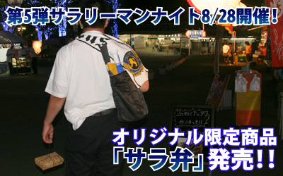 前回販売し、即日完売となった限定商品“サラリーマンナイトTシャツ”に続き、今回は、サラ弁を試合終了後に販売いたします。サラ弁は、サラリーマン、OLの皆さまが、会社帰りに同僚や友人とお酒を飲んだあと、お土産に買って帰る“折寿司”をイメージしたお弁当です。