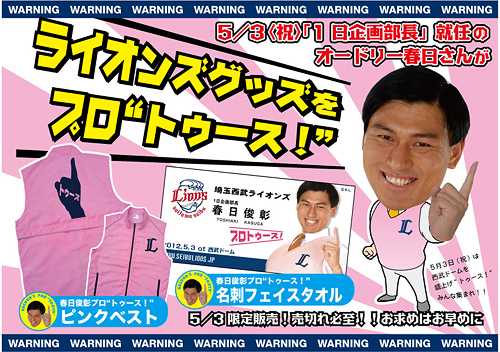 就任の挨拶代わりに球団の名刺デザインをフェイスタオルにした1日企画部長の特大名刺フェイスタオル、春日さん愛用のピンクベストを西武ドームで活用できるよう機能素材を使用し、背面には春日さんの決め台詞“トゥース!”をデザインしたベストを発売!