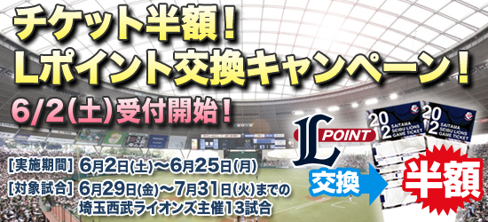 6月29日(金)~7月31日(火)のライオンズ主催試合計13試合で「チケット半額!Lポイント交換キャンペーン!」を実施!