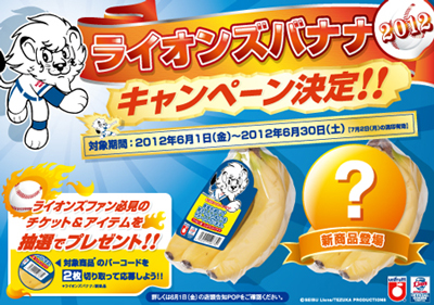 また、6月1日(金)〜30日(土)の期間中に、「ライオンズバナナ」および「ライオンズバナナ ホームラン」のバーコードを2枚切り取って応募すると、昨年に引き続き今年も9月1日(土)千葉ロッテ戦で実施される「ライオンズバナナスペシャル」にて、「始球式」「贈呈式」「ベースランニング」「選手入場子ども花道」等の権利が当たるキャンペーンを実施します。