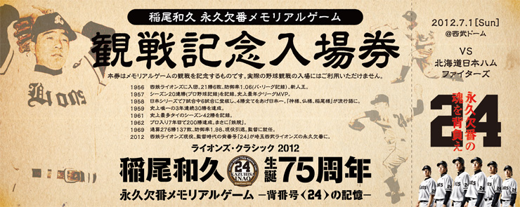 ライオンズ・クラシック 2012『稲尾和久 生誕75周年 永久欠番メモリアルゲーム ~背番号「24」の記憶~』として開催する、7月1日(日) 対北海道日本ハムファイターズ戦の全来場者に、同メモリアルゲームの観戦を記念して“観戦記念入場券”をプレゼント!