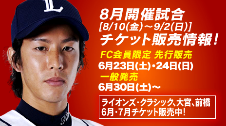 6月23日(土)・24日(日)は、8月11日(土)~19日(日)に開催する「西武鉄道創立100周年記念ユニ付きチケット」を含む、8月開催試合分のファンクラブ会員限定先行販売日です!
