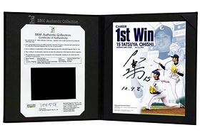 この商品は、大石投手のプロ初勝利を記念し、当日のピッチング写真をコラージュ・デザインしたデザインフォトに直筆サインが入った記念アイテムです。