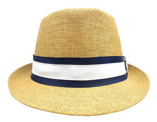 麦わら帽子風のボディにレジェンドブルーとホワイトのリボンを巻いた爽やかなハットになりました。