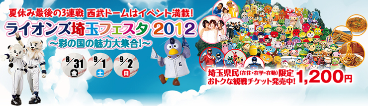 また「埼玉フェスタ 2012」開催に併せて、埼玉県内に在住・在学・在勤の方すべてを対象に、該当3試合の内野指定席Bを、最大で6割引となる1,200円(前日・当日/大人・こども共通)でご提供する特別観戦チケット「コバトンと行く!埼玉西武ライオンズ応援団」チケットも好評販売中です。
