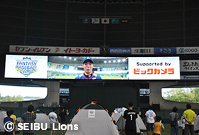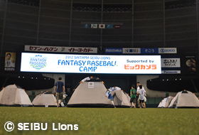 その後、ライオンズが見事に勝利した試合をご観戦いただき、再度皆さま集合後にフィールドにそろって入場。広いフィールドの中央でライオンズOBの大塚光二氏との交流会では、終始笑い声の絶えない時間を過ごしました。最後に親子で協力してテントを建て、シャワーを浴びて長い1日が終了しました。