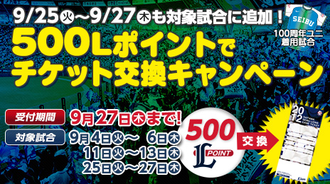 もちろん、現在実施中の9月13日(木)までの試合を対象とした「500Lポイントでチケット交換キャンペーン」も引き続き受付を実施!