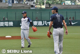 移籍2年目の鬼崎選手がバント練習やティー打撃を黙々とこなすと、セカンドの守備位置付近では、浅村、永江両選手が、奈良原守備・走塁コーチからノックを受け、時折コーチから檄が飛ぶ場面も。