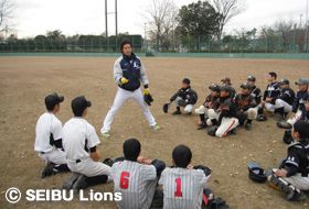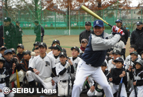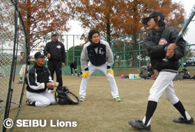 MY PAGE12月2日(日)、伊奈町記念公園において少年野球5チームと中学校1チーム100名を対象に、「埼玉西武ライオンズ野球教室」が開催され、坂元弥太郎投手と、今シーズン惜しまれつつ現役を引退した平尾博嗣氏と大島裕行(球団スタッフ)が講師を務めました。