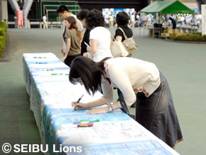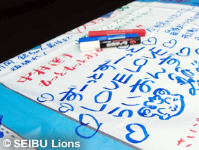 | 内容 | 横19メートル・高さ2メートルの横断幕を設けます。ファンの皆さまからライオンズへの応援メッセージを記入していただきます。なお、この横断幕は9月16日よりドーム前広場に掲出させていただきます。 |