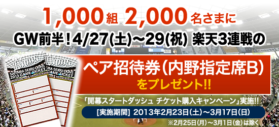 3・4月のライオンズ主催試合(公式戦)のチケット購入者の中から、抽選で1,000組2,000名さまに、人気のゴールデンウィーク前半・休日3連戦(4/27~29対楽天戦)の招待券(内野指定席)が当たる「開幕スタートダッシュ チケット購入キャンペーン」を実施!