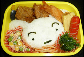 | 内容 | ご飯(目:煮豆・まゆげ:こんぶ・口:海苔)・唐揚げ・エビフライ・ウインナー・玉子焼き・スパゲッティー・ほうれん草のおひたし・ミッスクベジタブル |