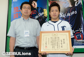 牧田和久投手が「静岡県知事顕彰」を受賞し、本日12日(水)、授与式が行われましたのでお知らせいたします。
