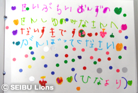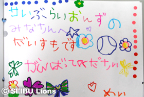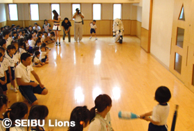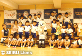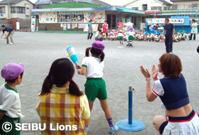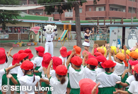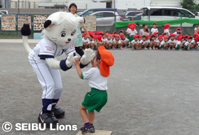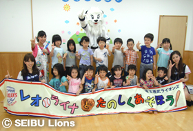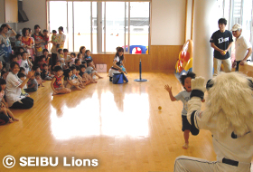 これは、『レオ・ライナと楽しく遊ぼう!』と題し、埼玉西武ライオンズのマスコット「レオ」・「ライナ」が地域の幼稚園・保育園・保育所を訪れ、園児たちと交流を図り、「仲間を思いやる気持ち」・「明るく元気な挨拶」・「ふれあいを通じて体を動かすことの楽しさ」を伝えることを目的に、心身の育成活動を目指して行っております。