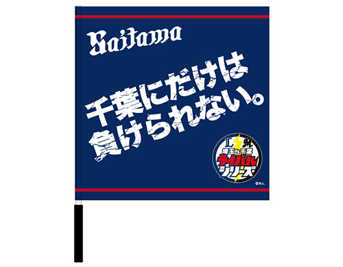 「埼玉vs.千葉ライバルシリーズ」の開催ポスターをデザインした「ライバルシリーズポスター柄ショートフェイスタオル」をはじめ、「千葉にだけは負けられない」の文字が入ったこのシリーズならではのオリジナルグッズ「ライバルシリーズ フラッグ」、「ライバルシリーズ フェイスタオル」、シリーズロゴをデザインした「ライバルシリーズ ロゴキーホルダー」が登場!