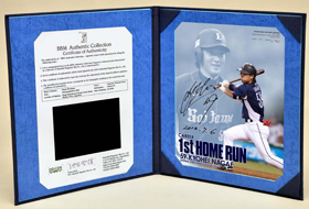 本商品は、永江選手のプロ初本塁打を記念し、当日のホームランの場面をコラージュ・デザインしたフォトに、直筆サインが入った記念商品です。