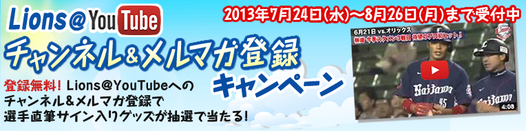 ホットな情報を配信中のLions@YouTubeをご覧の皆さんに「チャンネル&メルマガ登録」(いずれも無料)を行っていただくだけで、おトクな特典が抽選でもらえる夏のビッグ企画の開催をお知らせいたします!