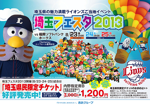 また、「埼玉フェスタ2013」開催に併せて、埼玉県内に在住・在学・在勤の方すべてを対象に、西武ドーム内野指定席B(県営大宮は、内野自由席A)が最大60%割引となる1,200円(前売・当日/大人・子ども共通)でご提供する「埼玉県民限定チケット」も好評販売中です。