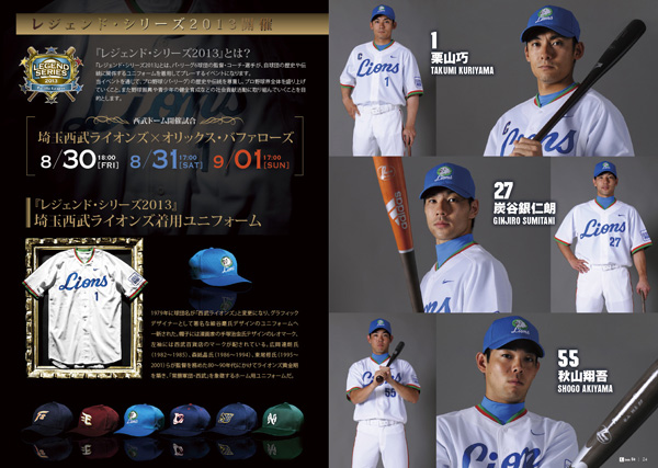 | 内容 | 2013年前半戦の戦いを振り返る PHOTO GALLERY (8月19日現在一軍出場全選手) 「埼玉フェスタ 2013」イベント情報 「レジェンド・シリーズ 2013」概要・撮り下し写真集 9月&10月の見どころ 選手名鑑 など |