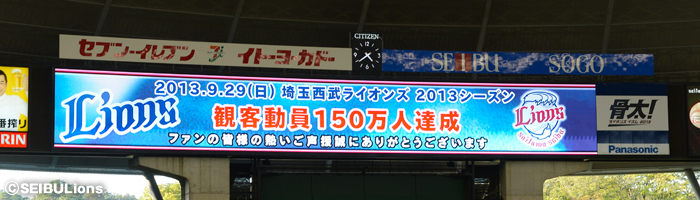 埼玉西武ライオンズは、本日9月29日(日)対千葉ロッテマリーンズ戦にて、今シーズンの主催公式戦の観客動員数累計が150万人を突破いたしました。